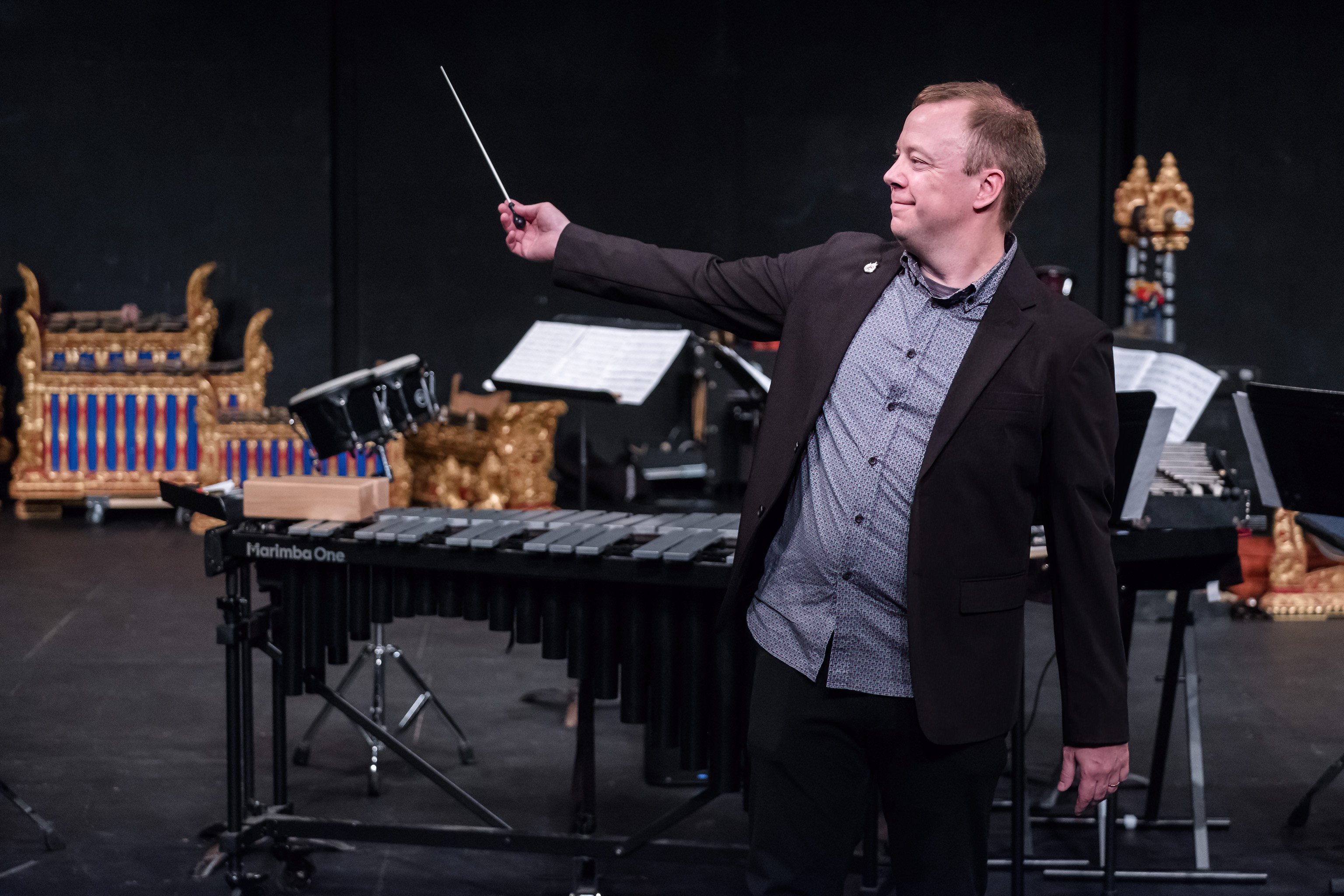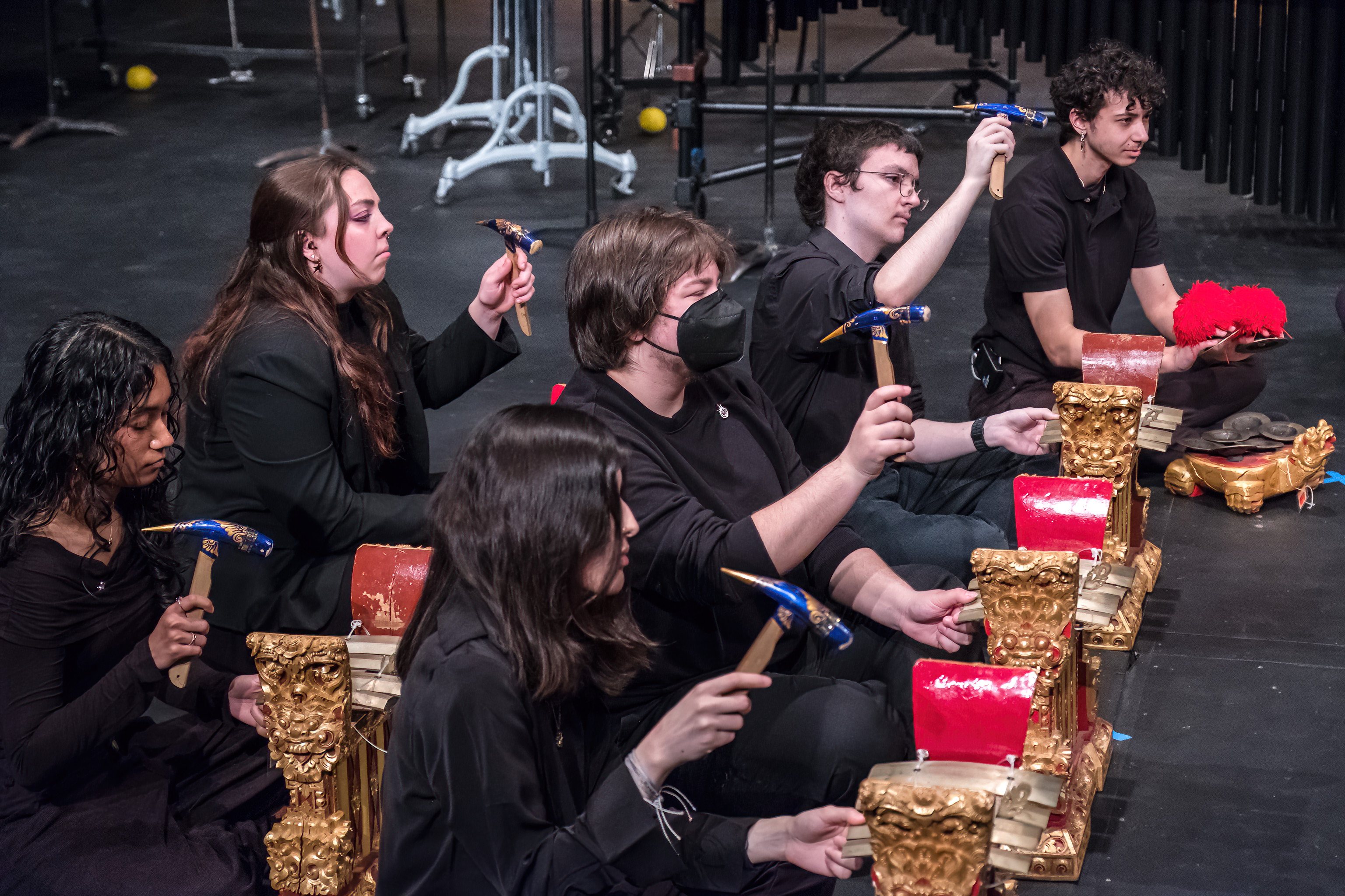Each year the ensemble performs a Fall concert of disparate pieces, while the Spring concert features a theme that connects the pieces. In spring 2025 the percussion ensemble incorporated gamelan into their concert.